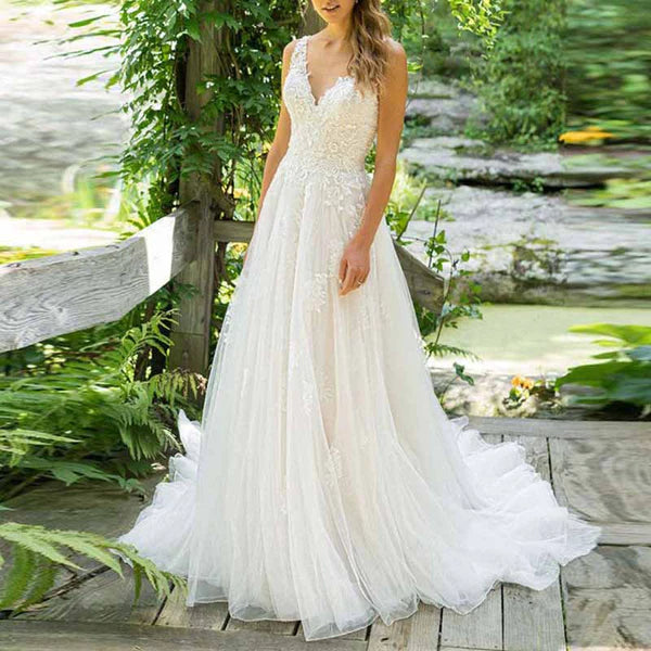 Applique V Neck Bridal Gown Sleeveless Wedding Dress