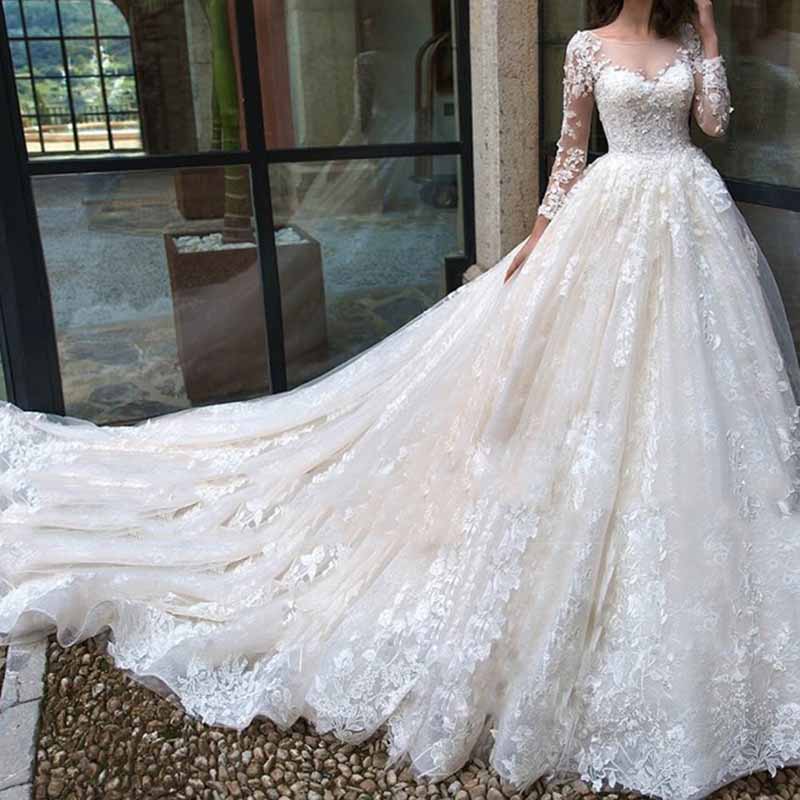 Long Sleeve Wedding Dresses Sweep Train Lace Applique A Line Bridal Gown