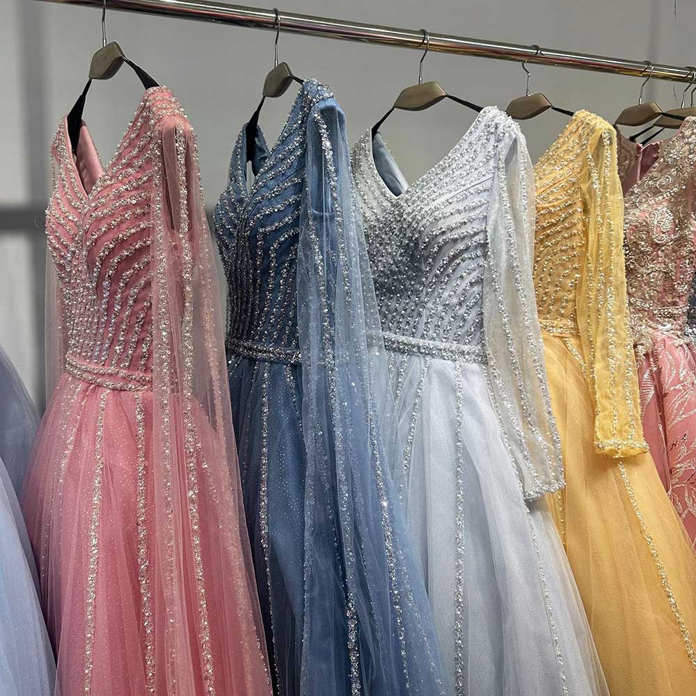 Long Sleeve Beaded Ball Gown V-Neck Formal Gowns